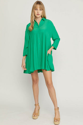 Solid long sleeve button down dress featuring tiering detail at back. Button closure at sleeves. Lined. Woven. Non-sheer. Lightweight.